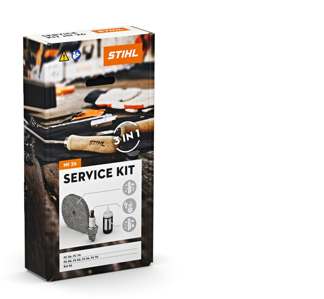 In de STIHL Service Kit 26 voor FC 56, FC 70, FS 40, FS 50, FS 56, FS 70, HT 56 en KM 56 vindt u de volgende onderdelen voor standaardonderhoud: